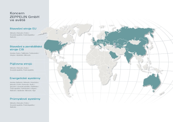 Zastoupení koncernu ZEPPELIN GmbH ve světě znázorňuje následujcí mapa, kterou lze stáhnout ve formátu PDF zde: