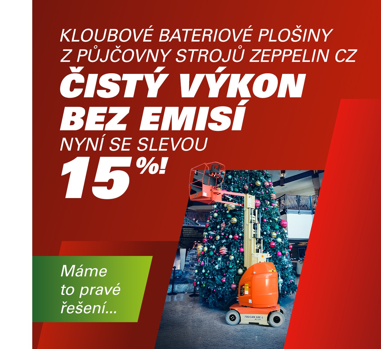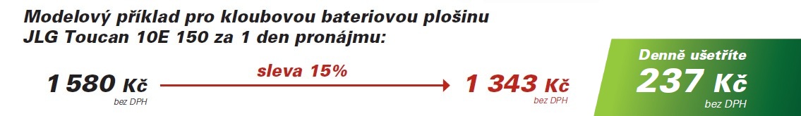Speciální akce platí v období od 1. 10. do 31. 10. 2025. Půjčte si v měsíci říjnu kloubovou bateriovou plošinu z naší flotily a získejte slevu 15%. Jsme flexibilní a máme pro vás to pravé řešení.