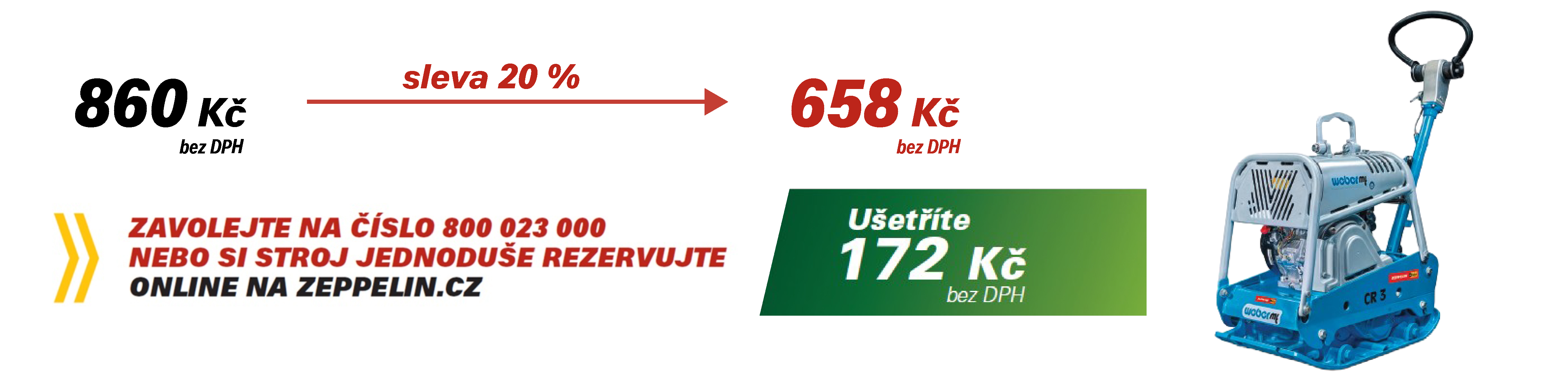 Snížení denní sazby pronájmu se vztahuje na vybrané modely z naší nabídky a platí pro smlouvy o pronájmu uzavřené od 1. 4. do 30. 4. 2026. Sleva se počítá z účtované ceny pronájmu a nelze ji kombinovat s dalšími slevami. Více informací u prodejců Půjčovny strojů Zeppelin CZ. Zeppelin CZ si vyhrazuje právo kdykoli akci zrušit či upravit. Pronájem strojů se řídí obchodními podmínkami pronájmu a platným ceníkem.
