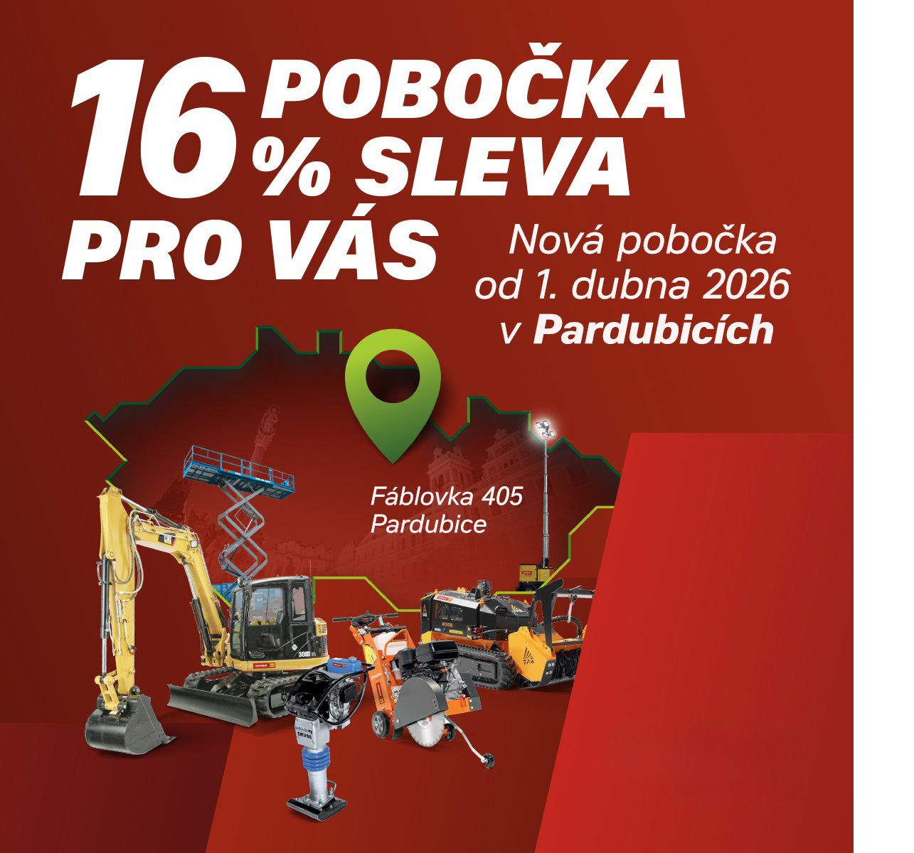 Síť Půjčovny strojů Zeppelin CZ se opět rozrůstá. Nově nás najdete také v Pardubicích, konkrétně na adrese Fáblovka 405, kde otevíráme naši již šestnáctou pobočku.