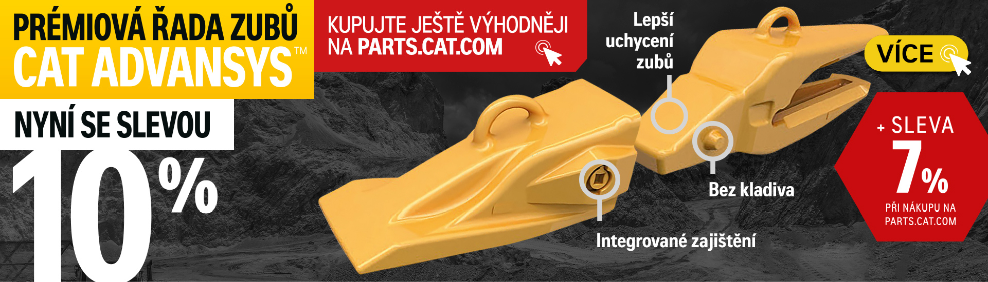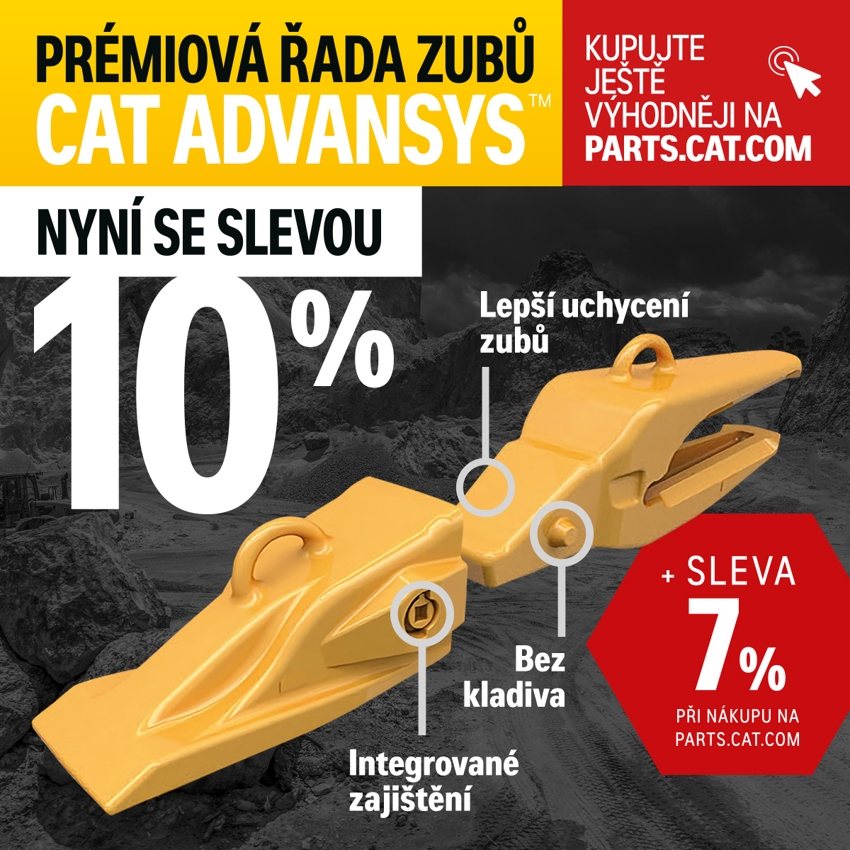 Při přechodu na zuby Cat Advansys z libovolného systému zubů (ať už od Caterpillar nebo jiného výrobce) dodáme sadu adapterů Cat Advansys ZDARMA. Adaptéry Cat Advansys jsou o polovinu méně namáhány a vydrží až o 25 % více výměn zubů než předchozí generace. Jejich výměna přitom ušetří až tři čtvrtiny času. Zuby Cat Advansys můžete objednávat také online na parts.cat.com a získat další slevu.