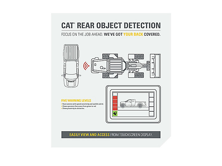 Funkce Cat Rear Object Detection pro kolové nakladače je dvoudílný systém, který zvyšuje přehled o mrtvých úhlech. Radar vydává vizuální a zvuková varování, když se překážka přiblíží do bezpečnostní zóny, zatímco kamera umožňuje obsluze sledovat prostor za strojem při couvání.